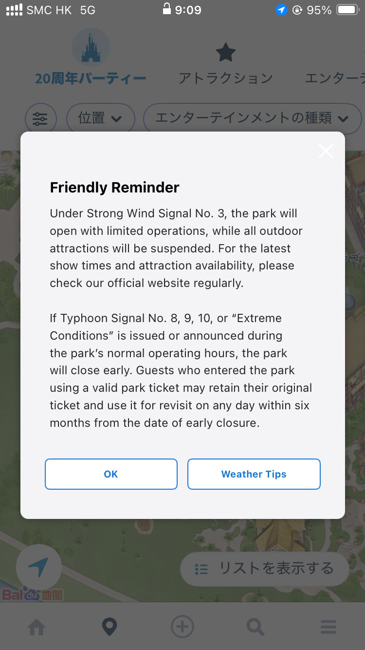 入場予定2日目の朝(台風上陸前日)に「シグナル3」が発令され、屋外アトラクションは利用不可と案内されました。