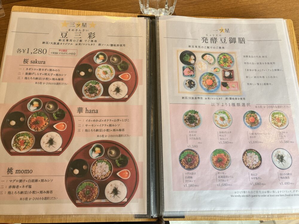 ランチメニューの「豆三彩(まめさんさい)」は三種の納豆ご飯が楽しめるお店自慢のセット。