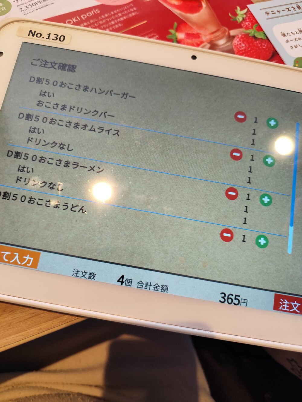 我が子4人は、オムライス、ハンバーガー、ラーメン、うどんをそれぞれ注文。