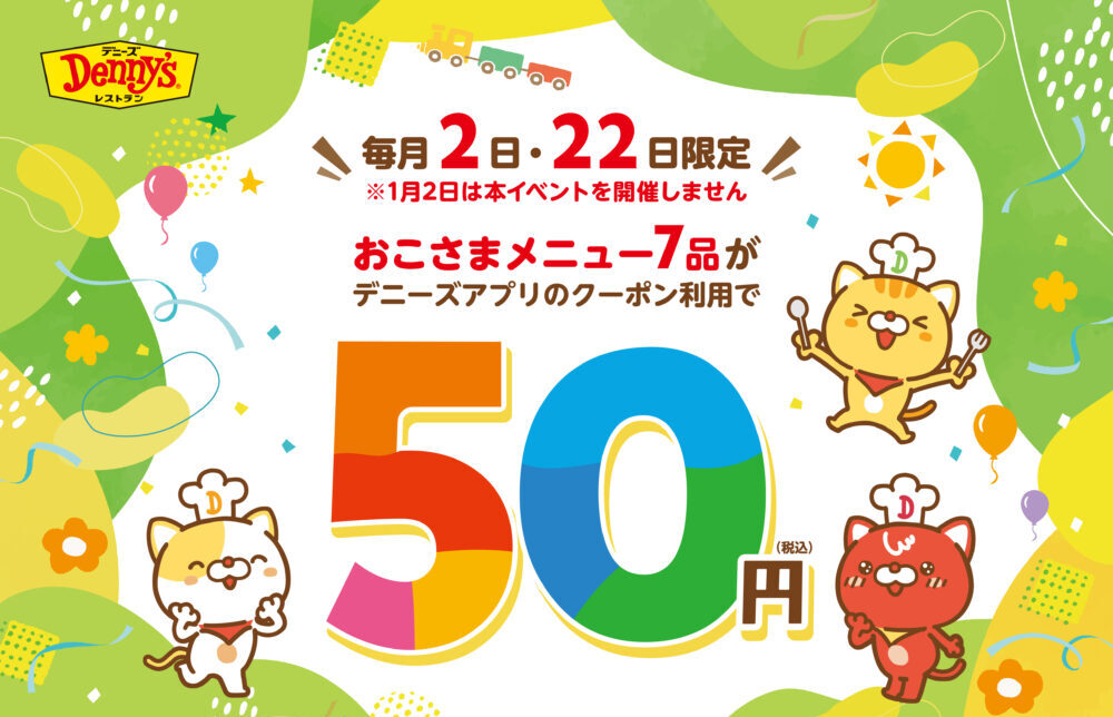 デニーズでは、毎月2日と22日に公式アプリのクーポンを使うと、お子様メニュー7品が1品50円(税込)になるんです。(1月は適応外)
